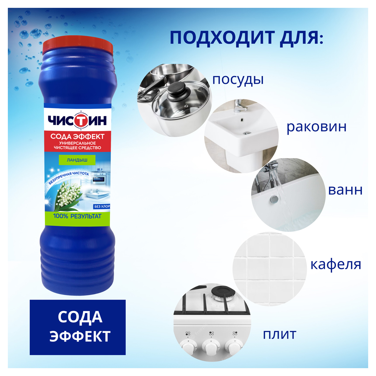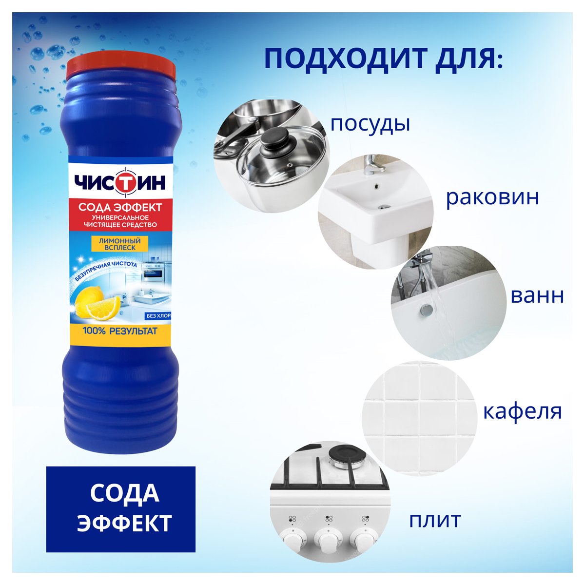 Средство предназначено для чистки кухонной посуды, газовых и электрических плит, раковин, ванн, унитазов, керамических изделий, кафеля, метлахской плитки, различных твёрдых поверхностей и т.п. Чистит, обезжиривает, удаляет налет и неприятный запах, накипь и коррозийные отложения. Без хлора. Состав: > 30% мрамор молотый, >5% <15% сода, <5% АПАВ, фосфаты, отдушка. ГОСТ 32478-2013.