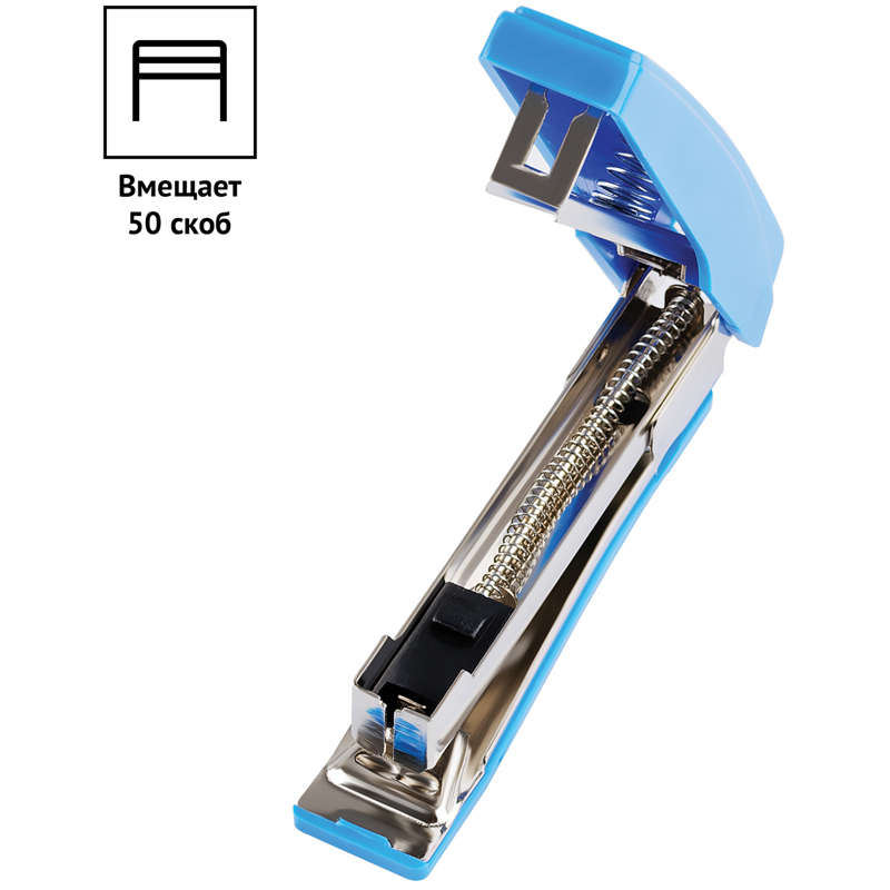Компактный степлер синего цвета имеет встроенный металлический антистеплер и скрепляет до 7 листов. Вмещает до 50 скоб № 10. Механизм скрепления выполнен из прочного металла, а корпус – из пластика. • Номер скобы: 10; • Количество скрепляемых листов: 7; • Материал корпуса: пластик.