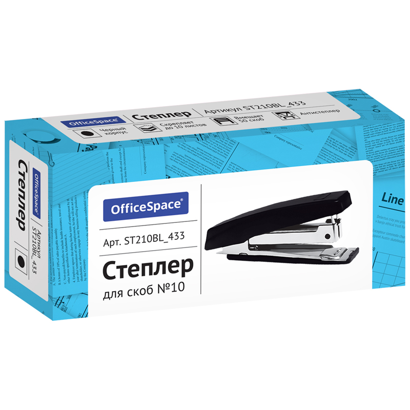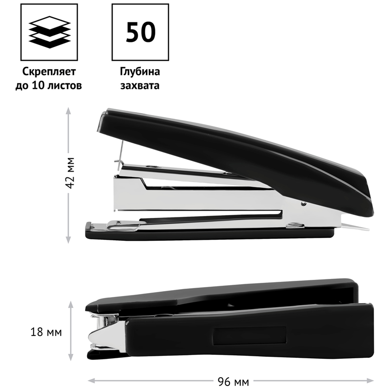 Удобный, пластиковый степлер для скоб №10, сшивает до 12 листов, вмещает 50 скоб, есть встроенный антистеплер. Цвет корпуса - черный.