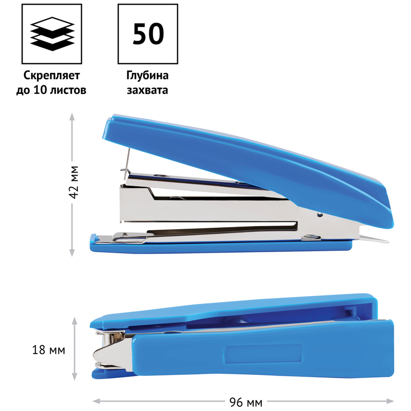 Удобный, пластиковый степлер для скоб №10, сшивает до 12 листов, вмещает 50 скоб, есть встроенный антистеплер. Цвет корпуса - синий.