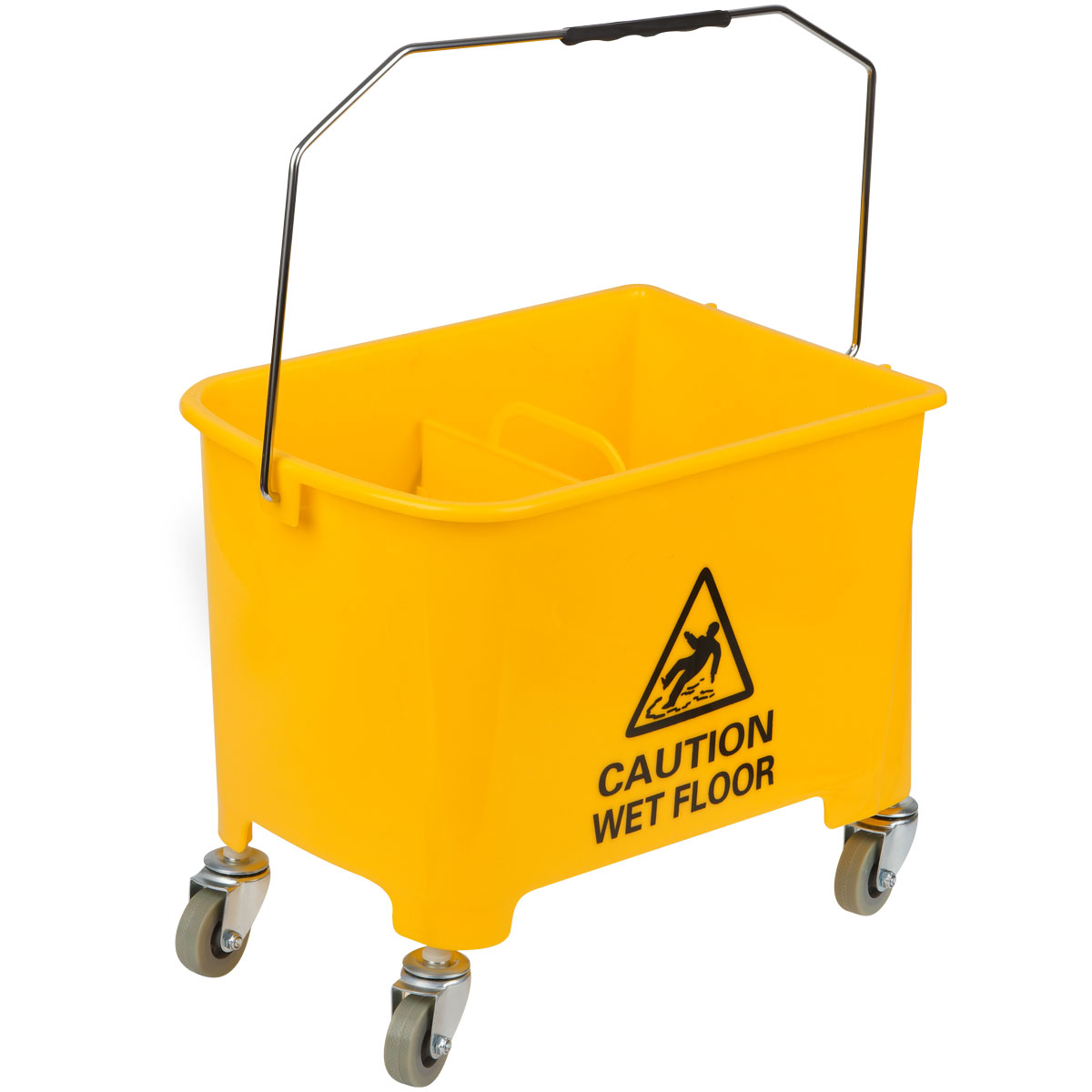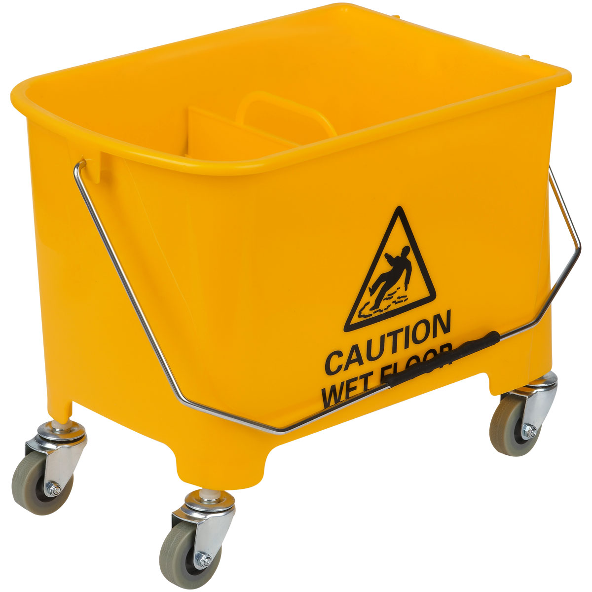 Ведро пластиковое. Объем – 20 литров. С перегородкой на 2 секции, перекидная метал. ручка, стальные поворотные колеса, механический отжим для петельных тряпок и МОПов.