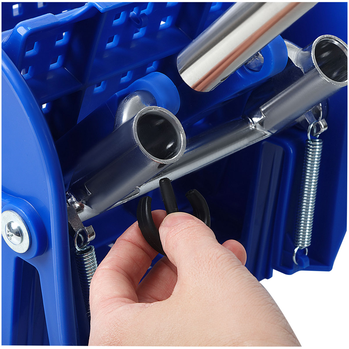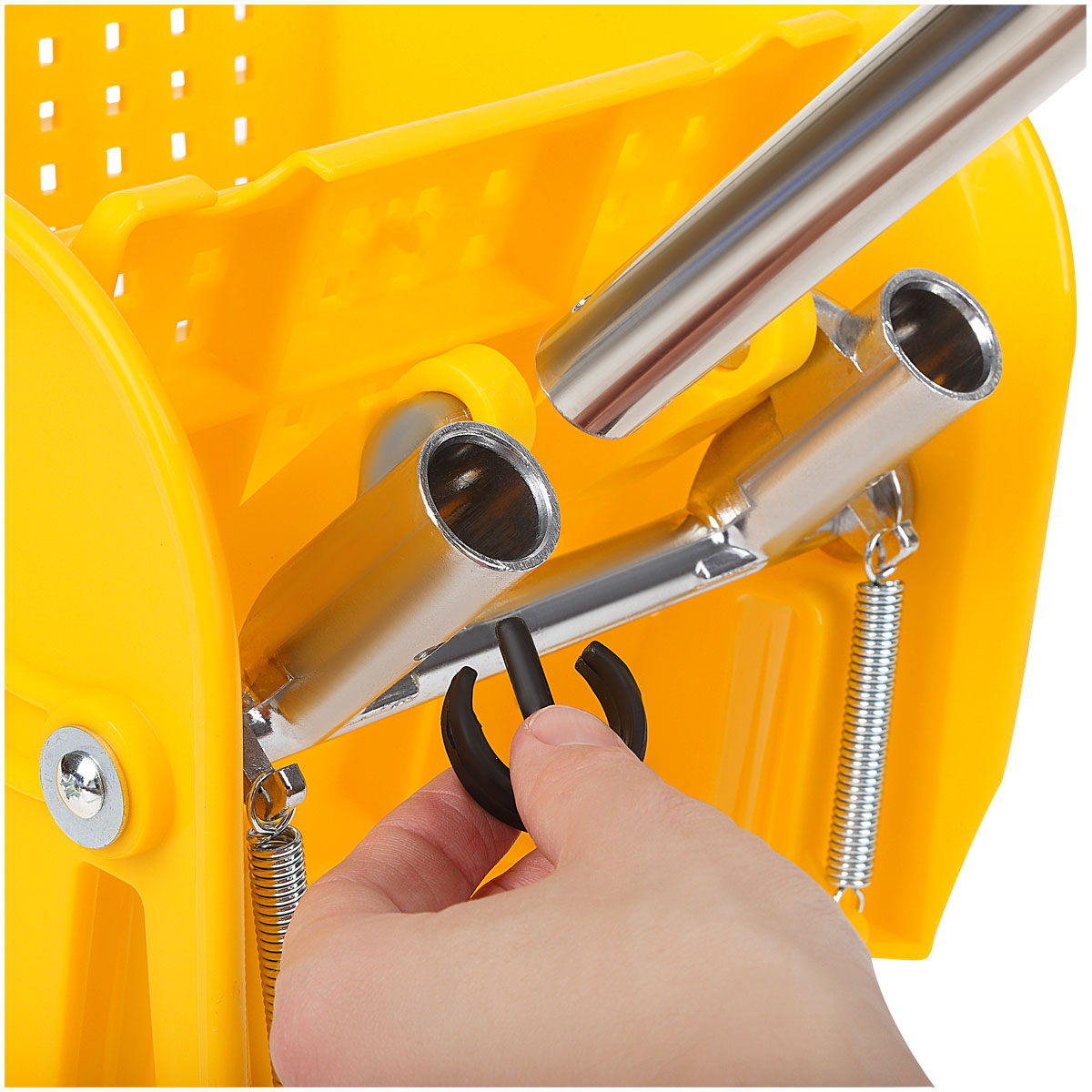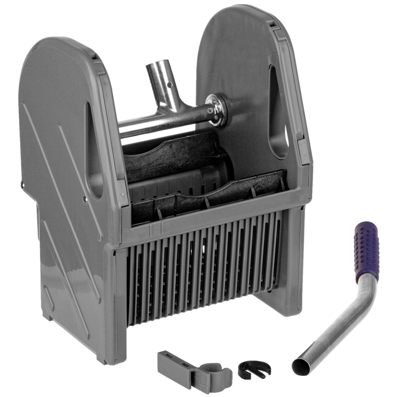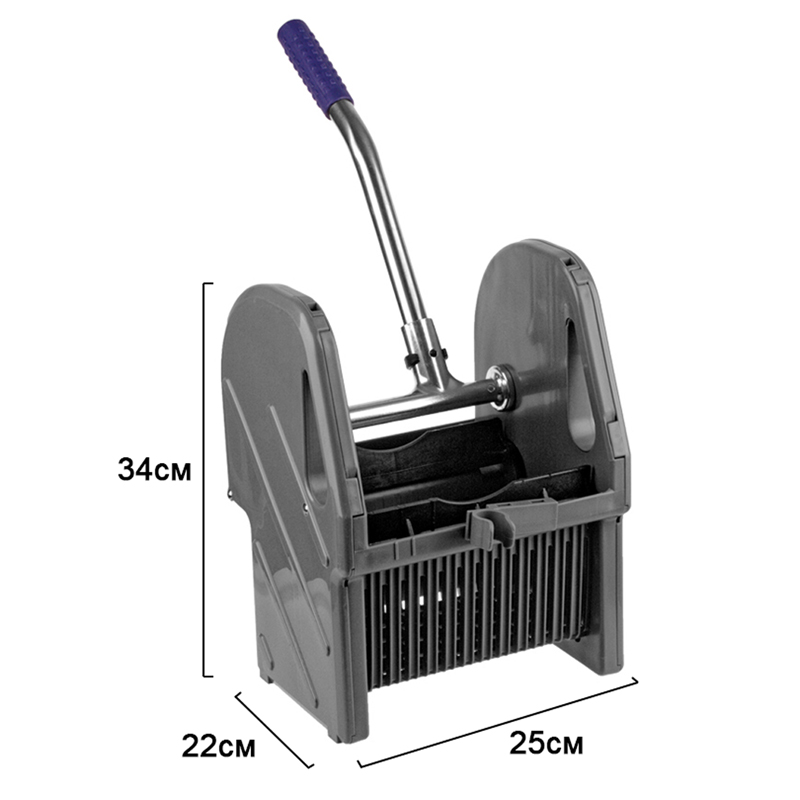Тележка одноведерная имеет стальной каркас, стальные поворотные колеса с пластиковыми протекторами и защитными бамперами, съемное пластиковое ведро 25л с пластиковой ручкой и носиком для слива воды, механический отжим для петельных тряпок и МОПов, металлическая сетка-лоток для расходных материалов позади ведра. Для тележки подходят швабры: 265261 + 265262, 266773 и насадки 271110, 271107, 271108, 271109, 303275, 303089 в комплекте с рукоятками/черенками 303092 и 303272.