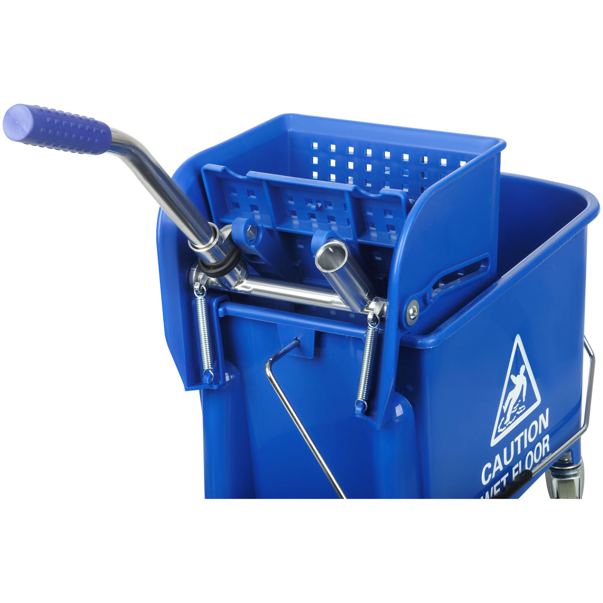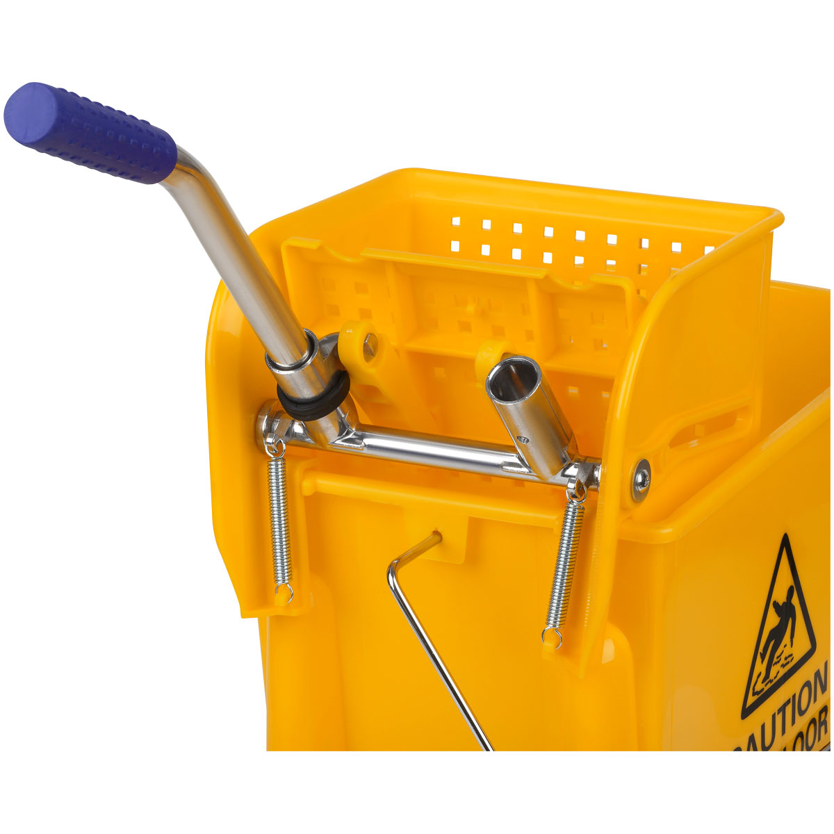 Тележка уборочная-ведро односекционная OfficeClean Professional, с механическим отжимом для веревочных и плоских МОПов*, на 4-х поворотных колесах диаметром 10 см, обеспечивающих легкую транспортировку и устойчивость на любой поверхности. Материал ведра - полипропилен (PP). Материал ручки ведра - полипропилен (PP). Материал механического отжима - полипропилен (PP), алюминий, железо. Материал ручки механического отжима - ПВХ и нержавеющая сталь. Материал колес - ПВХ и сталь. Размер: 45,5х37х97 см. Объем ведра - 31 л. Вес - 4,9 кг. Принцип действия механического отжима - вставить веревочный МОП в отжим и нажать ручку вниз для удаления лишней воды с насадки (МОПа). Данный вид уборочных тележек-ведер используется для проведения влажной уборки помещений небольшой площади. *Веревочные МОПы: 265262, 271110, 266774, 271107, 271108, 271109, 303275. Плоские МОПы в комплекте с флаундером (266764): 266765, 266766, 303081, 303085, 303274. Швабры: 266773 и 303078.