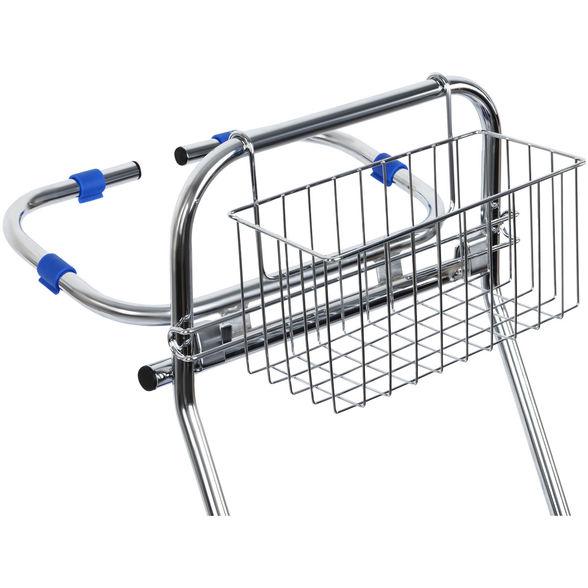 Тележка одноведерная имеет стальной каркас, стальные поворотные колеса с пластиковыми протекторами и защитными бамперами, съемное пластиковое ведро 25л с пластиковой ручкой и носиком для слива воды, механический отжим для петельных тряпок и МОПов, металлическая сетка-лоток для расходных материалов позади ведра.