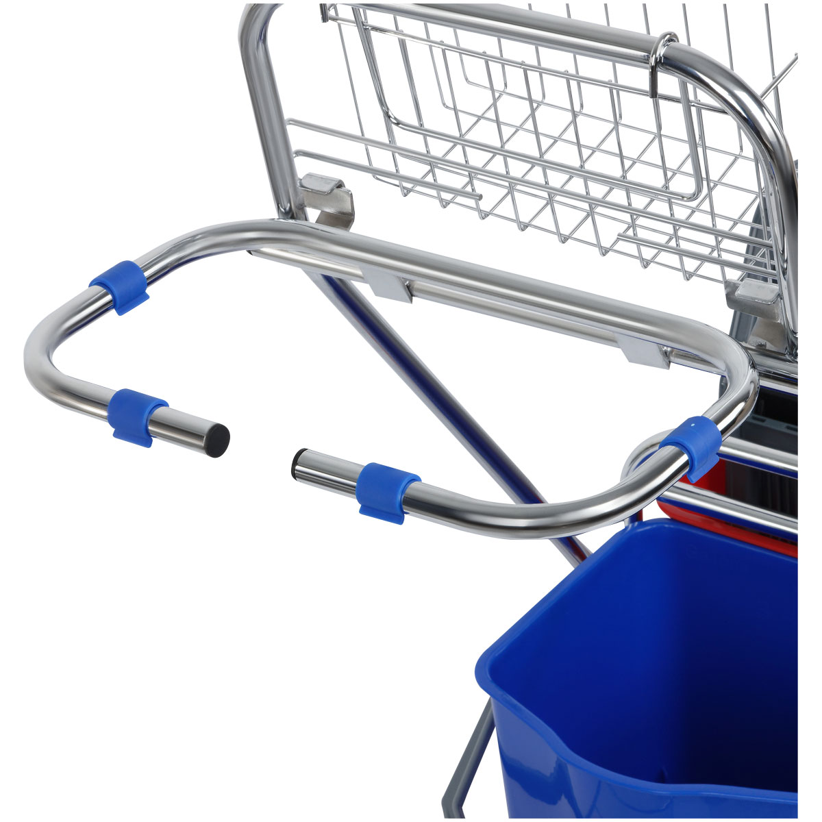 Тележка двухведерная с отжимом для петельных тряпов и МОПов, хромированный стальной каркас и перекидная ручка. Поворотные колеса с пластик.протекторами и бамперами. Два съемных ведра по 15л. с носиками для слива. Механический отжим для веревочных и плоских МОПов. Метал. сетка-лоток для хранения бытовой химии и других мелочей. Держатель для полиэтиленового мусорного мешка (мешок в комплект не входит).