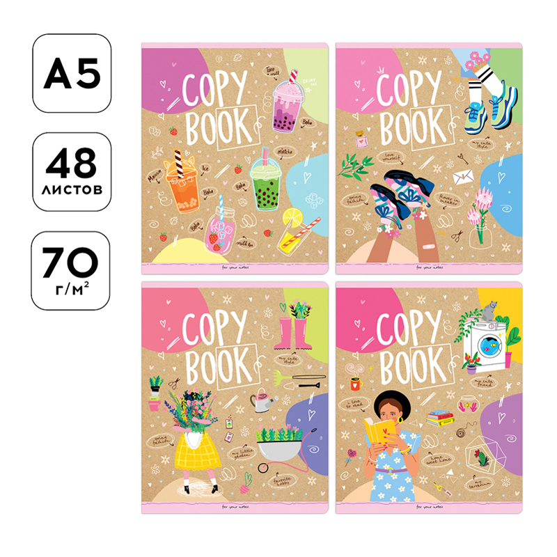 Тетрадь общая 48 л. на скобе, формата А5 (165*205 мм). Внутренний блок – офсетная бумага повышенной плотности 70 г/м², белизна 100%, клетка. Обложка изготовлена из импортного целлюлозного мелованного картона с двусторонней запечаткой.