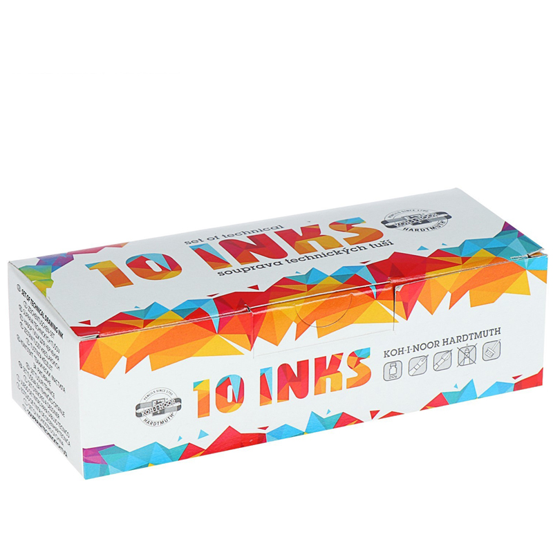 Тушь предназначена для оформительских работ, используется на бумаге и кальке. Яркий, насыщенный цвет. Наносится с помощью специальных перьев, кистей, а также деревянными палочками и поролоном. Все инструменты после работы следует отмывать водой, т.к. после высыхания тушь не смывается. Не допускать замерзания. Перед применением хорошо встряхивать. В наборе 10 цветов: белый, желтый, оранжевый, красный, пурпурный, фиолетовый, синий, зеленый, коричневый, черный.