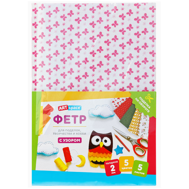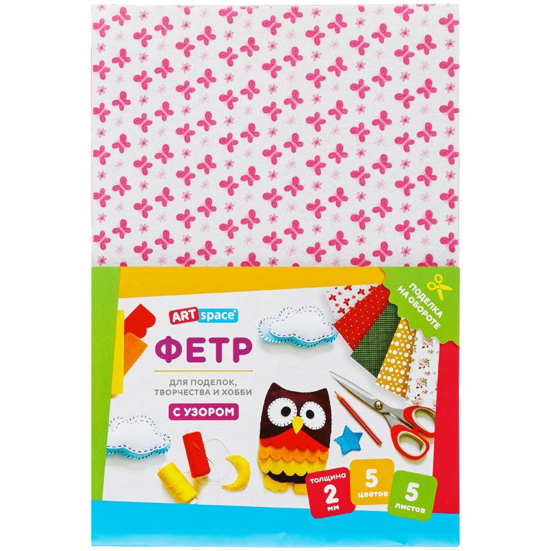 Фетр ArtSpace отлично подойдёт для пошива игрушек, книжек, украшений, сумочек, а также декора предметов интерьера. Мягкий и податливый материал хорошо держит форму, быстро склеивается и сгибается в любом направлении. Используется в различных видах творчества: шитьё, скрапбукинг, вышивка бисером, создание бижутерии. Богатая цветовая палитра порадует и детей, и взрослых. Создавайте неповторимые шедевры! Товар представлен в 5 листах, 5 цветов с узором. Размер: 210*297 мм. Толщина материала: 2 мм. • Размер: 210*297 мм; • Цвет: ассорти; • Толщина материала: 2 мм.