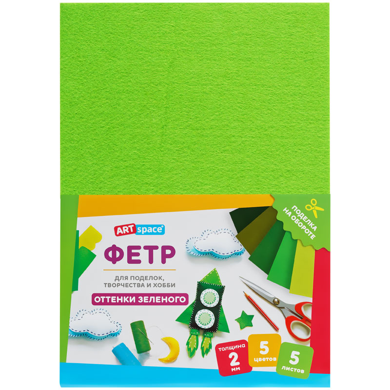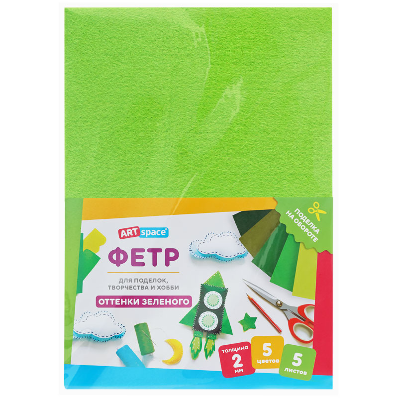 Фетр ArtSpace отлично подойдёт для пошива игрушек, книжек, украшений, сумочек, а также декора предметов интерьера. Мягкий и податливый материал хорошо держит форму, быстро склеивается и сгибается в любом направлении. Используется в различных видах творчества: шитьё, скрапбукинг, вышивка бисером, создание бижутерии. Богатая цветовая палитра порадует и детей, и взрослых. Создавайте неповторимые шедевры! Товар представлен в 5 листах, 5 оттенков зелёного. Размер: 210*297 мм. Толщина материала: 2 мм. • Размер: 210*297 мм; • Цвет: ассорти; • Толщина материала: 2 мм.