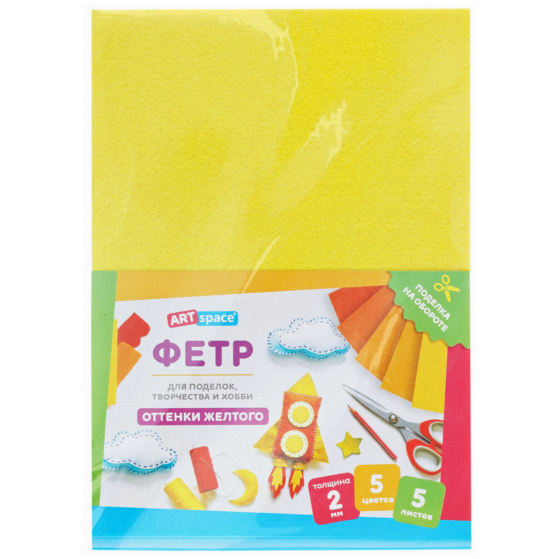Фетр ArtSpace отлично подойдёт для пошива игрушек, книжек, украшений, сумочек, а также декора предметов интерьера. Мягкий и податливый материал хорошо держит форму, быстро склеивается и сгибается в любом направлении. Используется в различных видах творчества: шитьё, скрапбукинг, вышивка бисером, создание бижутерии. Богатая цветовая палитра порадует и детей, и взрослых. Создавайте неповторимые шедевры! Товар представлен в 5 листах, 5 оттенков жёлтого. Размер: 210*297 мм. Толщина материала: 2 мм. • Размер: 210*297 мм; • Цвет: ассорти; • Толщина материала: 2 мм.