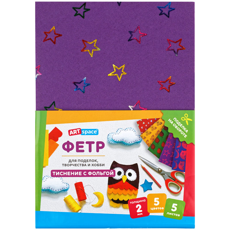 Фетр ArtSpace отлично подойдёт для пошива игрушек, книжек, украшений, сумочек, а также декора предметов интерьера. Мягкий и податливый материал хорошо держит форму, быстро склеивается и сгибается в любом направлении. Используется в различных видах творчества: шитьё, скрапбукинг, вышивка бисером, создание бижутерии. Богатая цветовая палитра порадует и детей, и взрослых. Создавайте неповторимые шедевры! Товар представлен в 5 листах, 5 цветов с тиснением фольгой. Размер: 210*297 мм. Толщина материала: 2 мм. • Размер: 210*297 мм; • Цвет: ассорти; • Толщина материала: 2 мм.