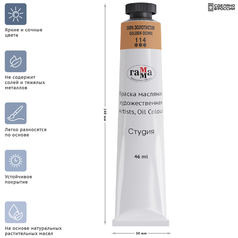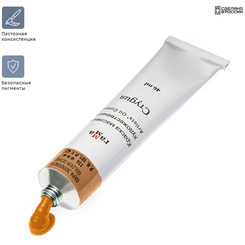 Штучная масляная краска серии «Студия» цвета золотистая охра не уступает тонкотёртым масляным краскам по степени перетира, пастозности и светостойкости. Состав красок экологически безопасен благодаря имитациям кадмиево-кобальтовой группы пигментов. Продукт идеально подходит для начинающих художников и студентов художественных училищ. Объём тубы — 46 мл. • Цвет: охра золотистая; • Упаковка: туба; • Объём тубы: 46 мл.